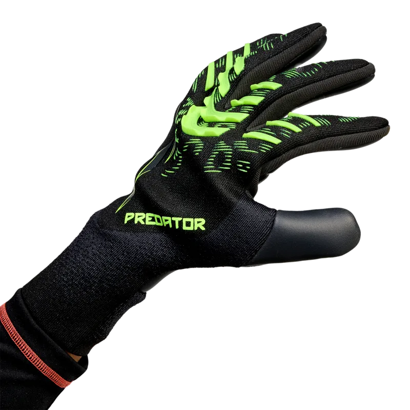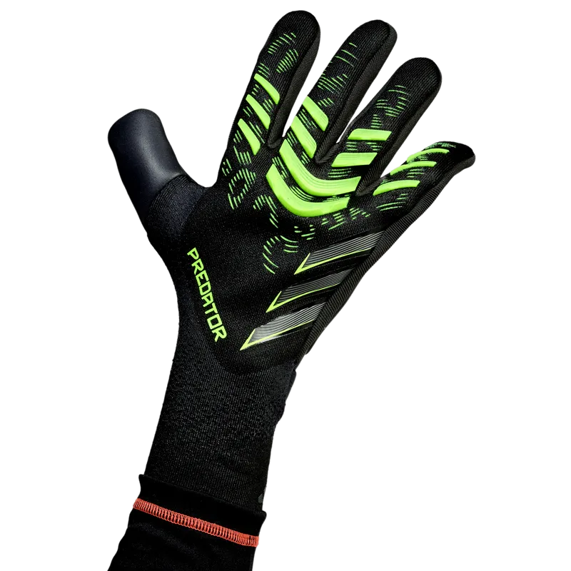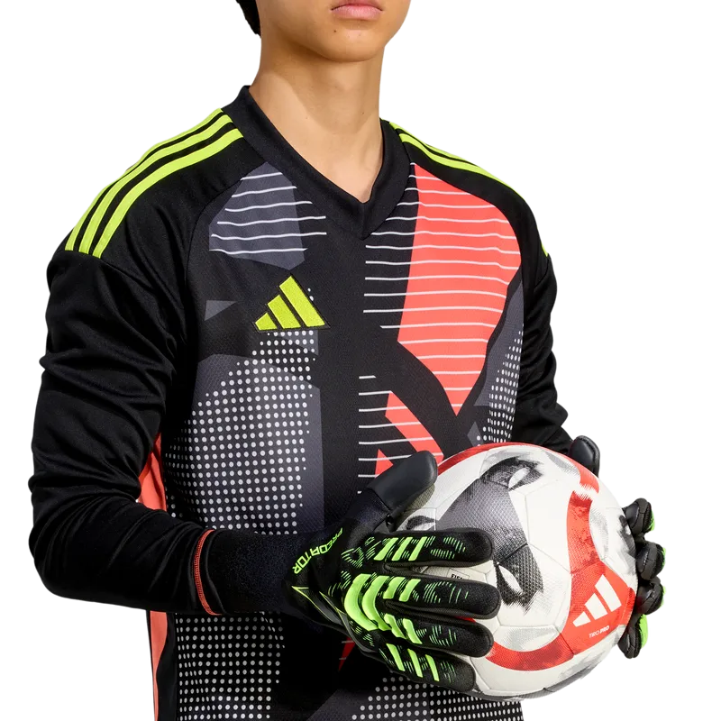 The stunning adidas Predator Pro goalkeeper glove from the Electric Stealth Victory pack features a sleek design accented with vibrant electric yellow highlights. It’s the number one choice for goalkeepers seeking maximum control, advanced technology, and premium comfort. Developed in close collaboration with professional goalkeepers, this glove incorporates cutting-edge features. With its optimized fit and improved entry, it ensures a perfect hold and a more secure grip, enhanced by the black URG 2.0 latex. Newly designed anatomically placed silicone elements on the backhand provide targeted support and exceptional control during punching clearances. The seamless full-silicone backhand combines a modern, clean look with top-tier functionality. Thanks to its ultra-flexible construction, the Predator eliminates all unnecessary resistance, enabling lightning-fast reactions in any game situation. Its lightweight design allows you to stay fully focused on the game without any distractions. With the adidas Predator glove, take control of the match and defend your goal with top-level performance!