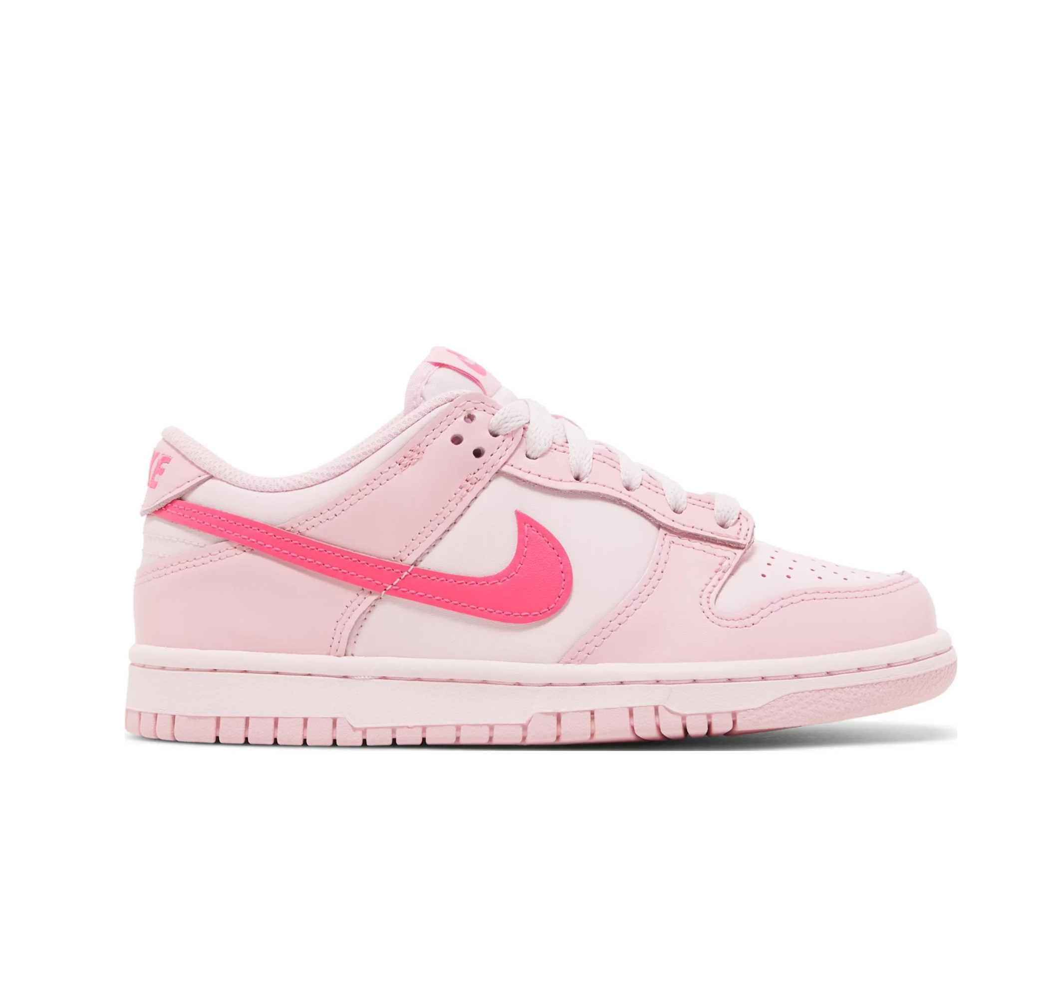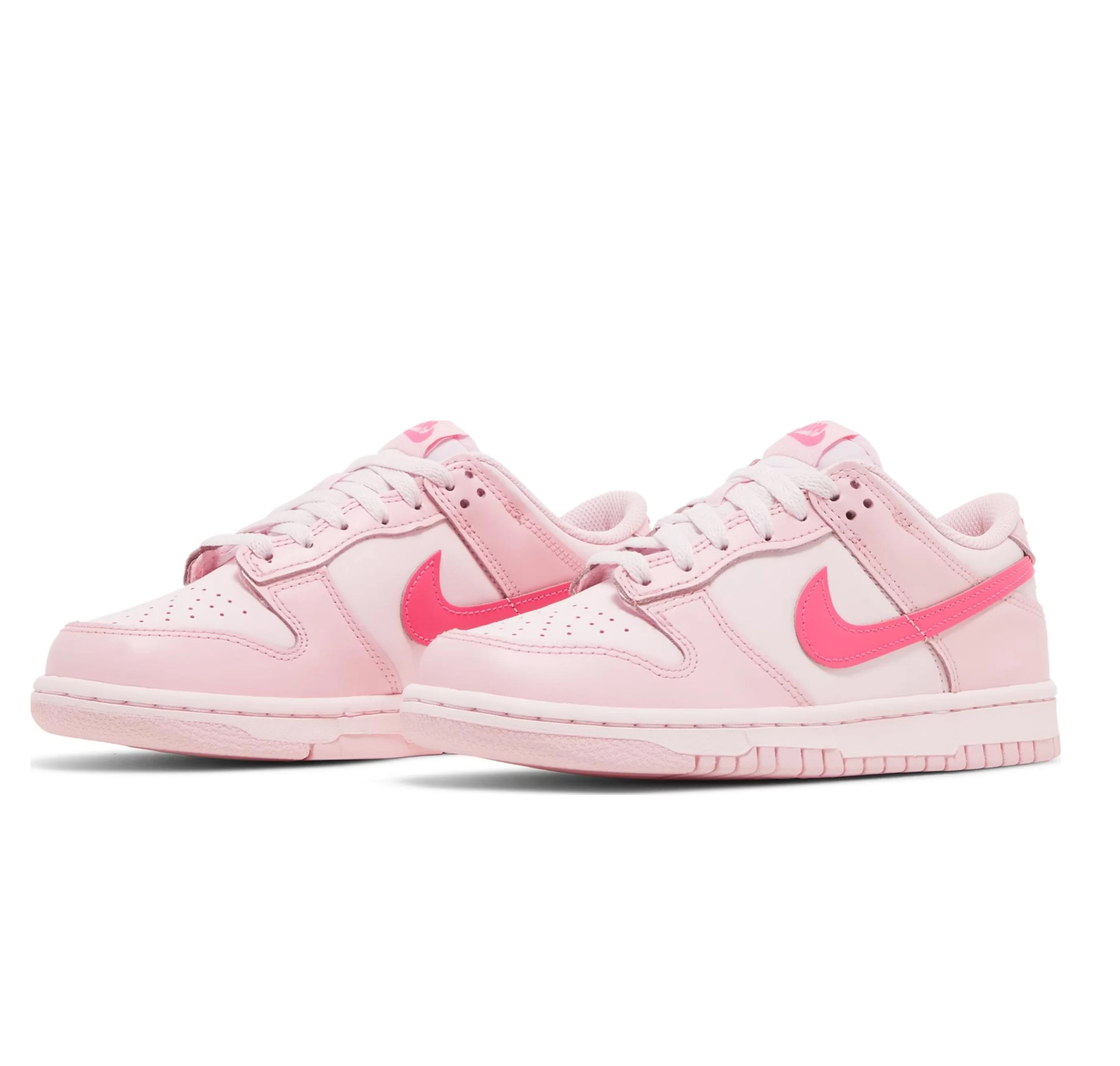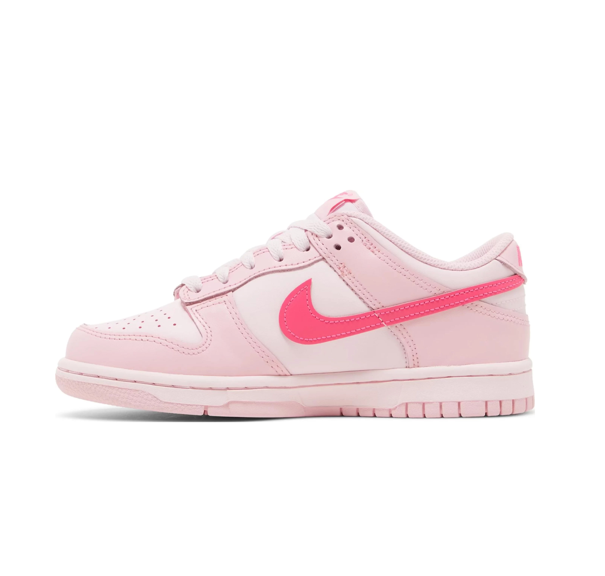 The look is completed by the Nike Swoosh in a bold pink that provides a strong contrast and stands out noticeably on the shoe. In addition to the Swoosh on both sides, the Nike Dunk Low Triple Pink (Grade School) features Nike branding on the sole, heel, tongue, and inner sole. This shoe comes in Grade School (GS) sizing.