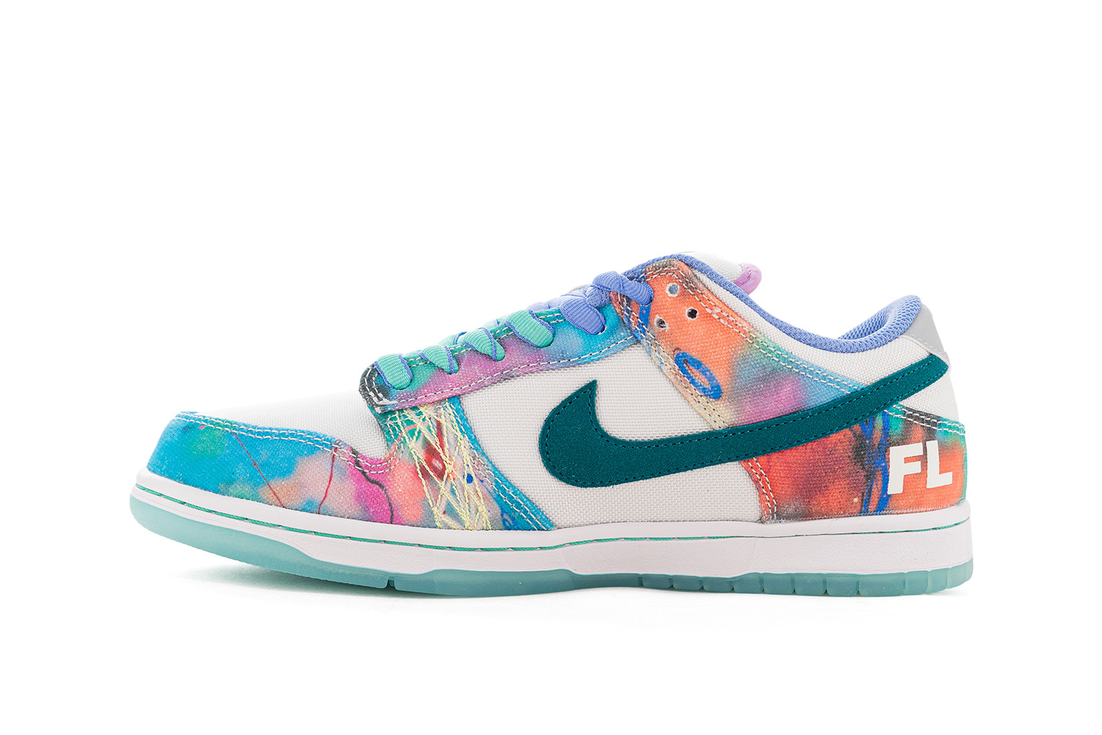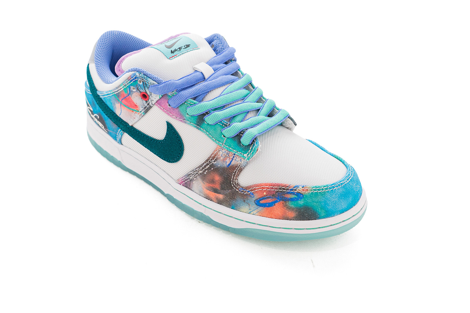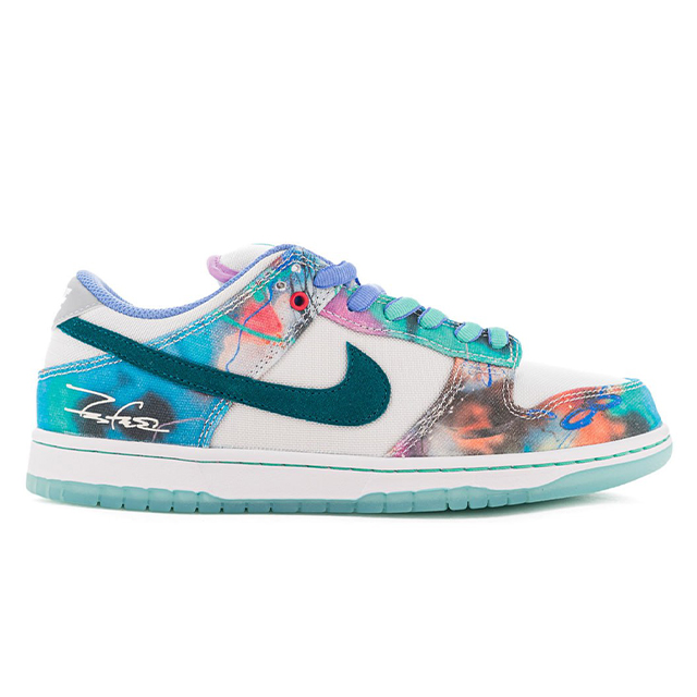 The Nike SB Dunk Low “Sean Cliver” bursts with artistic flair, featuring a vibrant watercolor-inspired print across its canvas overlays. Teal suede Swooshes and matching lace eyelets add depth, while subtle pops of pink, purple, and orange bring the design to life. The crisp white base provides balance to the playful color palette, and the translucent icy outsole completes the fresh look. Finished with Sean Cliver’s signature on the heel, this pair is a true blend of street style and creative expression.