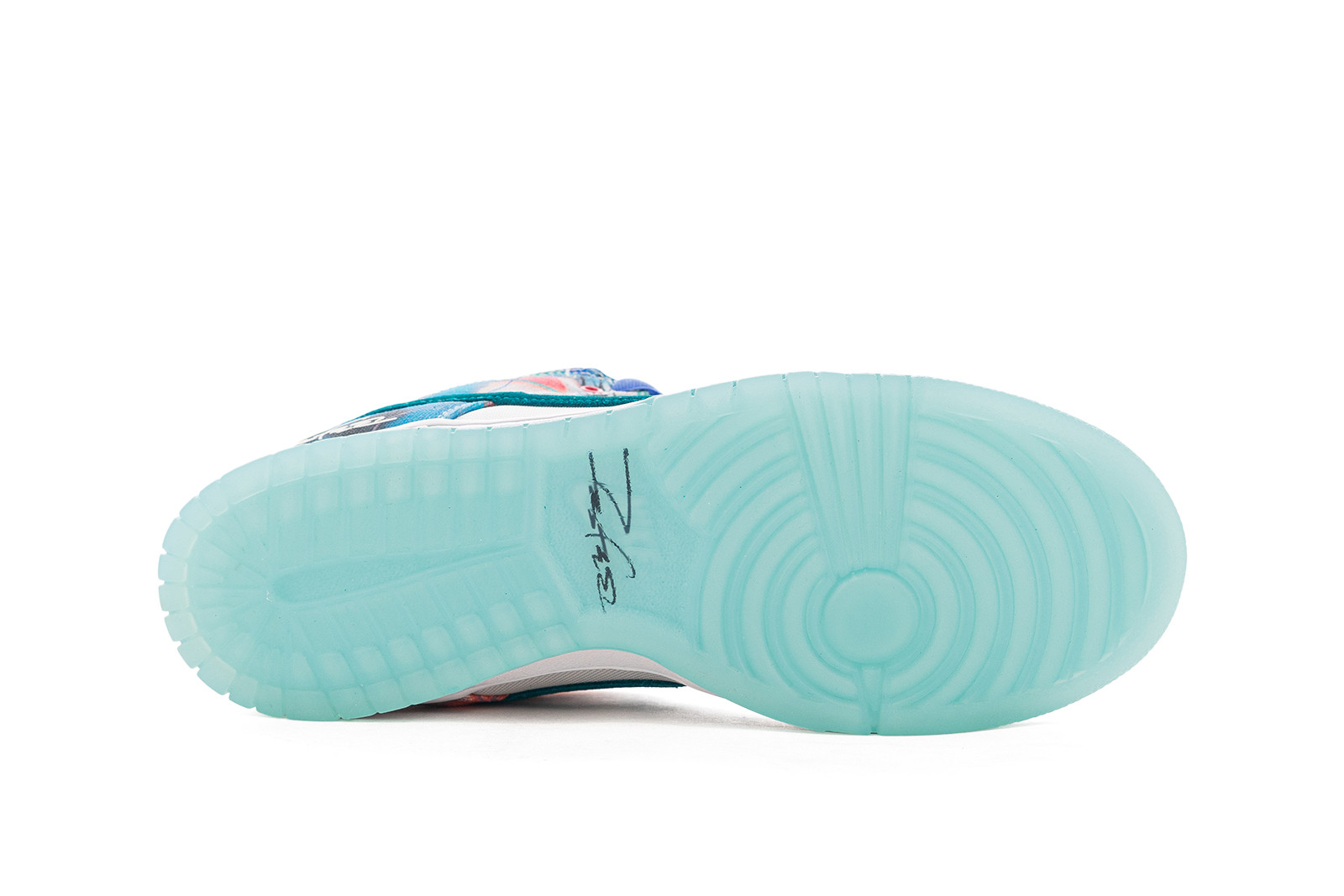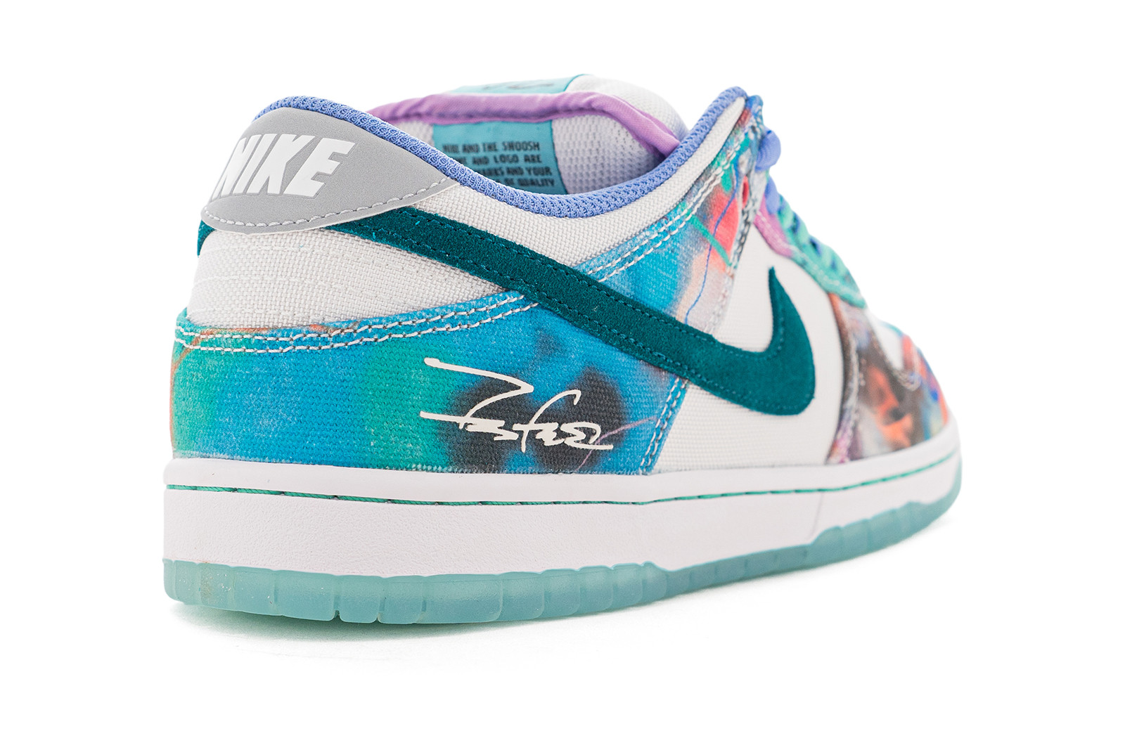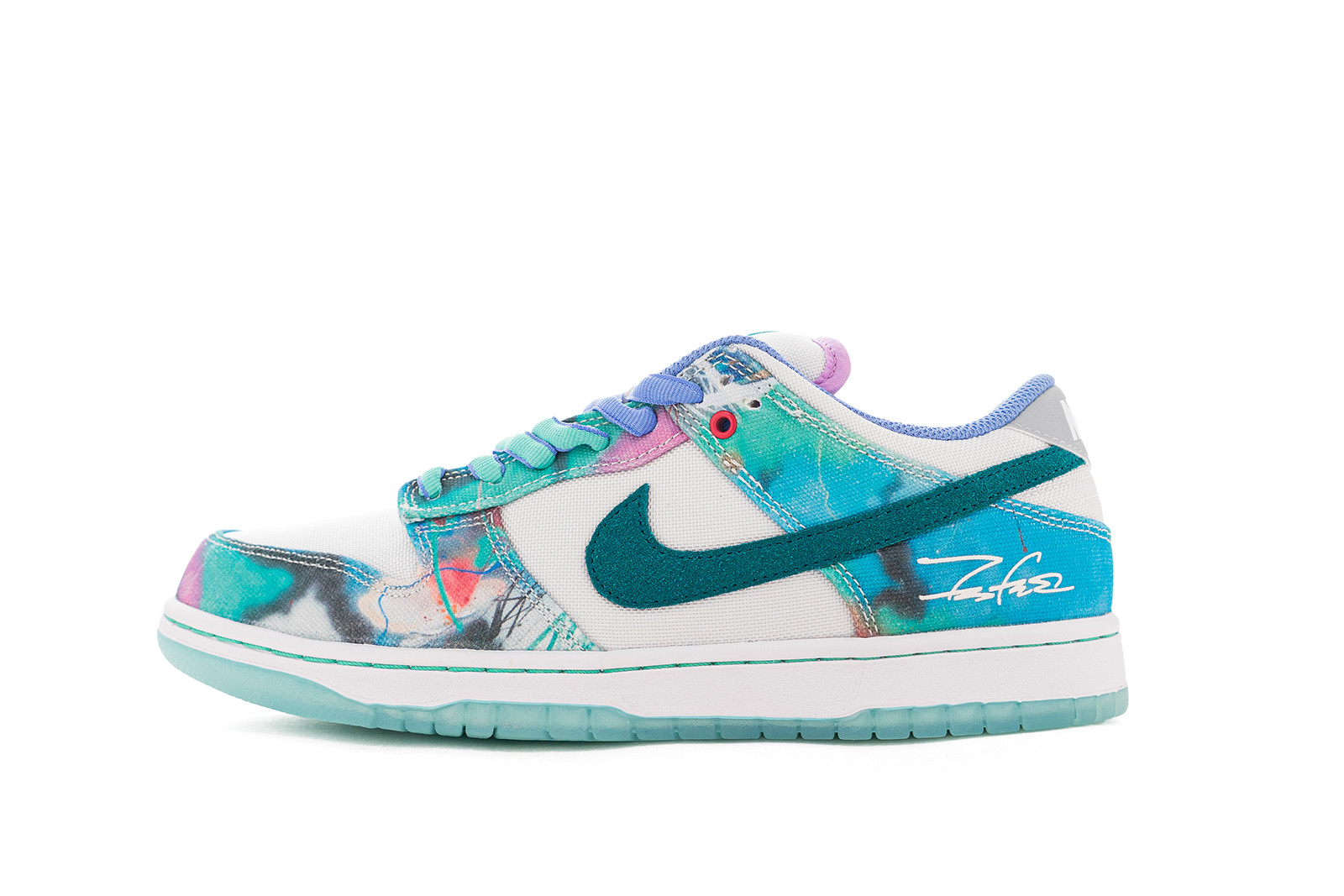 The Nike SB Dunk Low “Sean Cliver” bursts with artistic flair, featuring a vibrant watercolor-inspired print across its canvas overlays. Teal suede Swooshes and matching lace eyelets add depth, while subtle pops of pink, purple, and orange bring the design to life. The crisp white base provides balance to the playful color palette, and the translucent icy outsole completes the fresh look. Finished with Sean Cliver’s signature on the heel, this pair is a true blend of street style and creative expression.